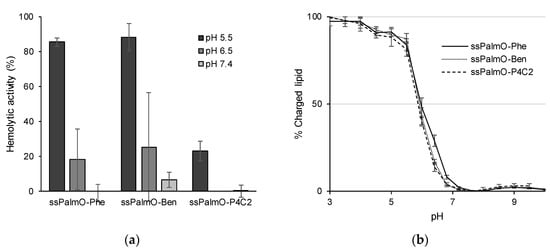 In the case of siRNA, the molecule is chemically more stable than mRNA, since its ribose structure has been artificially modified. However, for eliciting the maximum potency of the siRNA, it is important that the siRNA reaches the cytoplasm in double-stranded form []. It is known that the optimal pKa of LNP systems for the hepatic delivery of siRNA was 6.2–6.5 []. These observations suggest that the siRNA may need to be released in an intact form from the endosomal compartments at an early stage of the endocytosis process. The results shown in Figure 5a suggest that the optimal composition of LNPssPalmO-Phe for the delivery of siRNA has a suitable membrane-destabilizing ability, since hemolytic activity was observed at pH 6.5. To achieve a high endosomal escape efficiency, the optimal composition for siRNA required a large amount of ionizable lipids (up to 70% of the total lipids).
