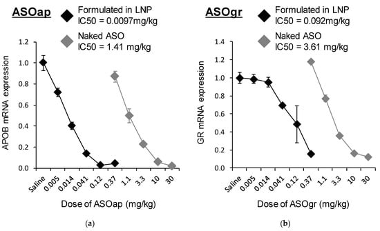 LNPssPalmO-Phe was applied for the delivery of ASO. To this end, we used an locked nucleic acid (LNA) gapmer ASO targeting ApoB (ASOap) and one targeting Nr3c1 (also known as the glucocorticoid receptor) (ASOgr) as ASO therapeutic models [,]. We initially hypothesized that the composition of ssPalmO-Phe/Chol = 70/30, the optimal composition for siRNA delivery, could be applied to ASO. However, it was revealed that LNPssPalmO-Phe containing ASO is highly unstable and susceptible to aggregation. To stabilize LNPssPalmO-Phe containing ASO, the lipid composition and lipid/ASO ratio were modified. It was ultimately found that the composition of ssPalmO-Phe/DOPC/Chol = 40/20/40 with an additional 1.5% of DMG-PEG2000 and a lipid/ASO ratio of 25 nmol/μg was suitable for preparing stable LNPssPalmO-Phe containing ASO (Table 3). The knockdown efficiency of LNPssPalmO-Phe–ASOap and LNPssPalmO-Phe–ASOgr was evaluated in the mouse liver at doses in the range of 0.005–0.37 mg/kg. As a comparison, naked ASO (ASOap or ASOgr) was injected in the range of 0.37–30 mg/kg as a control. The dose–response curve showed that the 50% inhibitory concentration (IC50) for hepatic knockdown by ASOap and LNPssPalmO-Phe–ASOap was 1.41 mg/kg and 0.0097 mg/kg, respectively (Figure 8a), indicating that the knockdown efficiency of LNPssPalmO-Phe–ASOap was 146 times higher than ASOap. For ASOgr, the IC50 for hepatic knockdown by ASOgr and LNPssPalmO-Phe–ASOgr was 3.61 mg/kg and 0.092 mg/kg, respectively (Figure 8b), showing that the knockdown efficiency of LNPssPalmO-Phe–ASOgr was 39.3 times higher than ASOgr. These observations indicate that LNPssPalmO-Phe significantly improved the delivery efficiency of ASO to the liver.