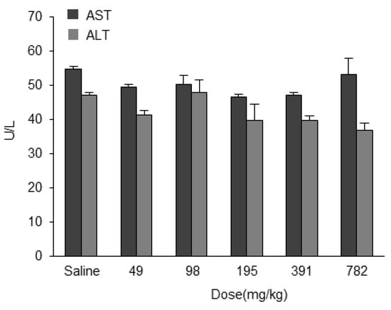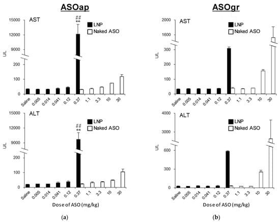 ASOap, ASOgr, ASOap-encapsulating LNPssPalmO-Phe and ASOgr-encapsulating LNPssPalmO-Phe were diluted to the appropriate concentrations with saline and administered to C57BL6/J mice intravenously at the indicated dose. The volume was adjusted to 10 mL/kg. At 96 h after injection, livers were isolated from mice and stored in RNAlater RNA Stabilization Reagent (Qiagen, Valencia, CA, USA) overnight. Livers were homogenized using a BioMasher II (Nippi, Tokyo, Japan). Total RNA was isolated from mouse liver tissues using the RNeasy Mini Kit (Qiagen, Valencia, CA, USA) according to the manufacturer’s protocol. qRT-PCR was performed using a One Step TB Green PrimeScript PLUS RT-PCR Kit (TAKARA Bio, Inc., Shiga, Japan) and analyzed with a 7500 Fast Real-Time PCR System (Applied Biosystems, Foster City, CA, USA). The primers used in this study are shown in the Supplementary Materials. The level of target gene expression was normalized to that of mouse Glyceraldehyde 3-phosphate dehydrogenase (GAPDH). Hepatotoxicity evaluation was performed as described above.