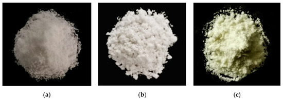 Photographs of powders of (a) MTZ, (b) EG and (c) MTZ-EG. The color change after the two starting powders were grinded together is evident.