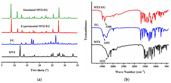 FT-IR spectra can be used to infer changes in hydrogen bonding upon cocrystallization by analyzing the frequency shifts of the vibrational bands of the functional groups under consideration [40]. Since the frequency of O-H stretching generally falls in the 3600–3200 cm−1 spectral range, characteristic absorption peaks at 3222 cm−1 in the spectrum of MTZ and 3452 cm−1 in the spectrum of EG are assigned to O-H stretching. The spectrum of MTZ-EG has a new absorption peak at 3388 cm−1, indicating the participation of hydroxyl groups of MTZ and EG in new hydrogen bonding (Figure 2b).