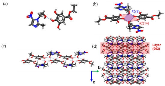 (a) Asymmetric unit, (b) hydrogen bonds between the two pairs, (c) 1D chain and (d) 3D packing of MTZ-EG viewed along the a axis (a 2D layer is highlighted).
