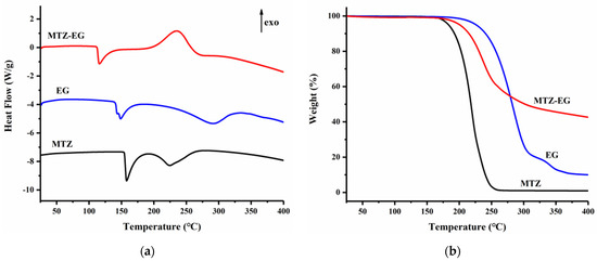 (a) DSC and (b) TG curves of MTZ-EG, MTZ and EG.