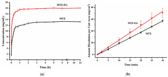(a) Powder dissolution rate and (b) IDR of MTZ-EG and MTZ.