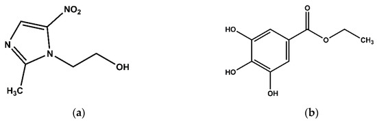 Chemical structures of (a) metronidazole (MTZ, MW= 171.15 g/mol) and (b) ethyl gallate (EG, MW= 198.17 g/mol).