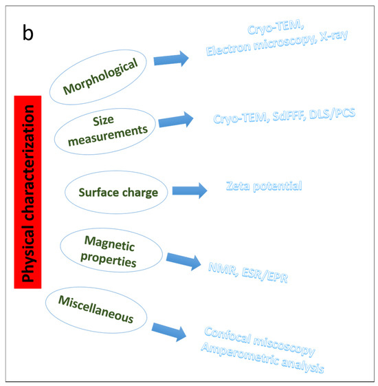 Furthermore, the comparison and utility of techniques have been discussed in order to make a protocol for better evaluation of nanomaterials [93]. The morphology of nanoparticles can be investigated by TEM, SEM, and X-ray studies while the size can be measured using DLS, SdFFF, and optical microscopy. To understand surface charge chemistry, zeta potential measurements are helpful. However, NMR, ESR, and confocal microscopy can be useful to establish a complete understanding of physical parameters as well as in vivo investigation of nanoparticles.