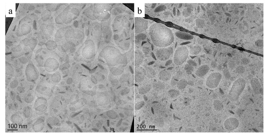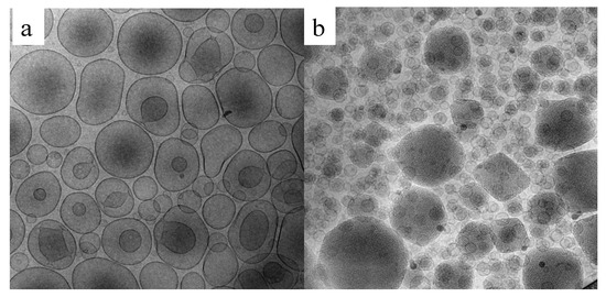 Cryogenic transmission electron microscopy (Cryo-TEM) is a useful method for analyzing liquid dispersions in a very close way to their native state, revealing morphology and inner details. Milky nanosized liquid dispersions can be accurately identified by cryo-TEM. Indeed, the possibility of vitrifying the samples brings the frozen sample very close to what the real dispersion is [101]. Uni- or oligo-lamellar vesicles, lamellar phases, cubic phases, cubosomes, exosomes, etc. can be visualized and measured one by one (see Figure 4).