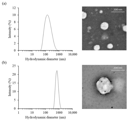 The morphological characteristic of cationic niosomes and nioplexes were observed via transmission electron microscope (TEM). PCNs had a unilamellar spherical shape and smooth border. The particles obtained from the TEM image were approximately 87 to 186 nm for PCN-B and PCN-B/siRNA complexes, respectively. While the particle size of PCN-B and PCN-N/siRNA complexes from Zetasizer nano ZS were 141.3 ± 7.5 and 697.6 ± 50.9 nm, respectively (Figure 1a,b). The particles obtained from the TEM image were in the dried state and consequently smaller particle sizes, while the bigger particles obtained from Zetasizer nano ZS were in the water-containing state. The zeta potential of PCN-B and PCN-B/siRNA complexes were 54.8 ± 0.2 and 10.4 ± 5.4 mV, respectively.