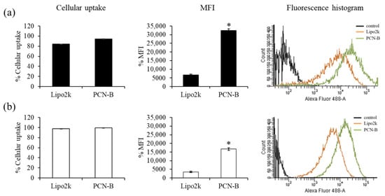 First, cellular uptake of fluorescently-labeled siRNA with Alexa Fluor 488 (siAF488) was performed to ensure that PCN-B/siRNA complexes could effectively deliver siRNA into MCF-7 and MDA-MB-231 cells. The uptake of siAF488 can be evaluated by measuring the green fluorescent signal of siAF488 through flow cytometry analysis. The ratio of transfection agents used in this study was guided by the reported weight ratios of transfection agents: siRNA presenting high silencing efficiency, i.e., 2.5 and 15 for lipofectamine® 2000 (Lipo2k) and PCN-B, respectively [42]. Transfection was performed under the presence of 10% serum. The result revealed high cellular uptake in both cell lines (Figure 2a,b). The transfection efficiency of siRNA complexes of PCN-B and Lipo2k was as high as 95 and 84%, respectively, in MCF-7 cells. As presented in Figure 2, the mean fluorescent intensity (MFI) of cells transfected with siAF488 using PCN-B as transfection reagent was significantly higher than that of Lipo2k, suggesting that PCN-B could deliver high amounts of siRNA into both cell lines. This result suggested that PCN-B might be a potential cationic lipid with a high siRNA delivering capacity for breast cancer cells.