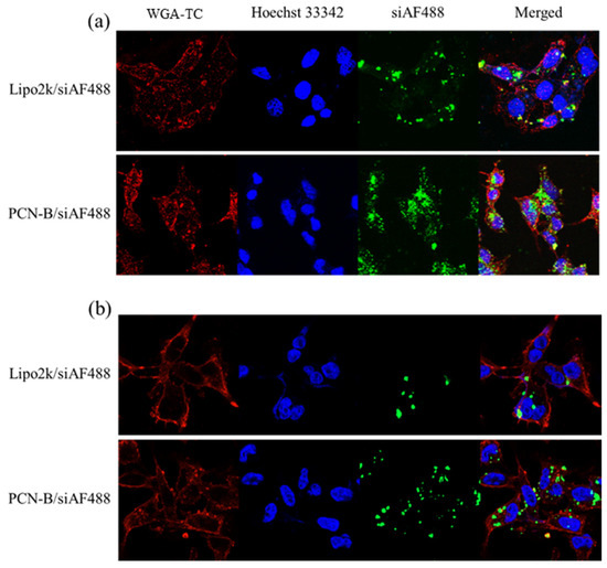 Intracellular distributions of siAF488 complexes transfected with Lipo2k and PCN-B for 24 h in (a) MCF-7 cells and (b) MDA-MB-231 cells by confocal laser scanning microscope (CLSM).