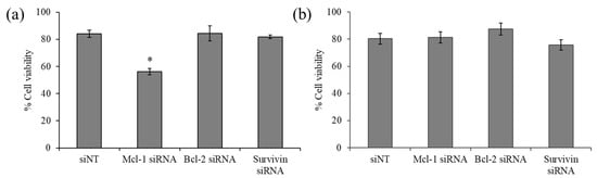 Cell viability of indicated siRNA targeting (Mcl-1, Bcl-2, and survivin) using delivery of PCN-B in (a) MCF-7 and (b) MDA-MB-231 cells. * p < 0.05.
