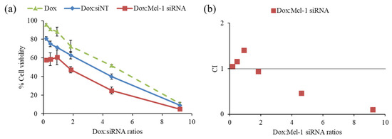 The present study of a range of Dox and Mcl-1 siRNA combination ratios (0.2–9.2) indicated that Dox and Mcl-1 siRNA were synergistic with a CI value < 1 at 2–9.2 µM and suppressed the viability of MCF-7 cells by 50–90%. High inhibition is more relevant in clinical therapy for anticancer and antiviral agents, particularly those within the range of 75–90% [46,57]. The therapeutic outcome of drug combinations depends on the ratio and concentration of each agent. As the cardiotoxicity of Dox was frequently detected at a higher dosage, this toxicity was expected to decline with the lower dosage of Dox.