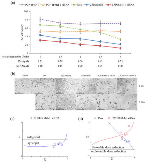 The synergistic effect of Dox and Mcl-1 siRNA was further investigated with the constant ratio experiment. In this experiment, cells were treated with five different concentrations of Dox and Mcl-1 siRNA. While the ratio of Dox:Mcl-1 siRNA was fixed at 2.5 for all conditions, the concentration of Dox and Mcl-1 siRNA in this analysis ranged from 0.25–0.75 and 0.1–0.3 µM, respectively, resulting in 1-, 1.5-, 2-, 2.5-, and 3-fold increases in the concentration of the combination compared to the lowest concentration baseline (Figure 6a). The cell viability was evaluated by MTT assay and further analyzed by CompuSyn software. For control, the viability of cells treated with a single agent at the same concentration as that used in the combination was also examined and presented as dashed lines (Figure 6a). Although some cytotoxic effects were observed in the mock siRNA control (2.5Dox:siNT), the synergistic effect of 2.5Dox:Mcl-1 siRNA was detected at every concentration point tested. Of note, the cytotoxic activity of Mcl-1 siRNA remained unchanged within the concentration range tested (0.1 to 0.3 µM) (Figure 6a). Cell density and morphology were also observed under an inverted microscope (Figure 6b). The density of cells treated with the combination markedly decreased compared to cells individually treated with each agent at the same concentration. The loss of cell density and the presence of shrunk and detached cells increased by increasing the concentration of the combination.