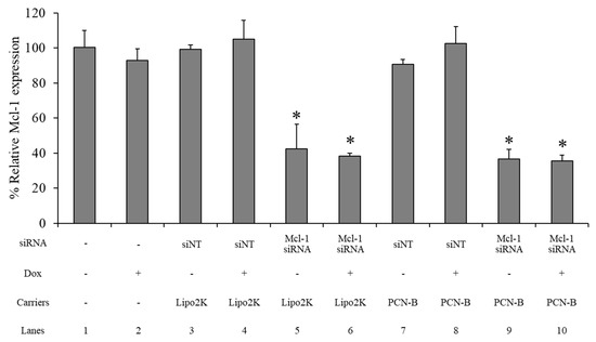 The Mcl-1 mRNA expression level of the MCF-7 cells treated 0.1 µM of Mcl-1 mRNA, using PCN-B or Lipo2K as the transfection agent with and without 0.25 µM of Dox in combination, was determined by real-time PCR. The siNT complex was employed as a negative control for each formulation. The Mcl-1 mRNA expression level was normalized with untreated cells and presented as % relative mRNA expression. The Mcl-1 expression level was not affected by the Dox or siNT treatment transfected with either PCN-B or Lipo2K (Figure 7: lane 2, 3, 4, 7, 8). Approximately a 60% reduction of Mcl-1 mRNA was observed in the Mcl-1 siRNA treatment with either Lipo 2K (Figure 7: lane 5, 6) or PCN-B (Figure 7: lane 9, 10). The addition of Dox did not affect the Mcl-1 downregulation efficiency of the Mcl-1 siRNA treatment (Figure 7: lane 6, 10).