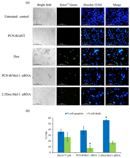 Double-stain apoptosis detection was observed under an inverted fluorescence microscope (100X) (a) after 24 h of treatments; untreated control, PCN-B/siNT, Dox (0.75 µM), Mcl-1 siRNA (0.1 µM), and the combination of Dox (0.25 µM) and Mcl-1 siRNA (0.1 µM) at the molar ratio of 2.5. Apoptotic and dead cells were counted and compared to all cells in the same area, presenting as % cell apoptosis (blue fluorescent cells) and cell death (green fluorescent cells) (b). * The data was significantly different from the Dox treatment at p-value < 0.05.