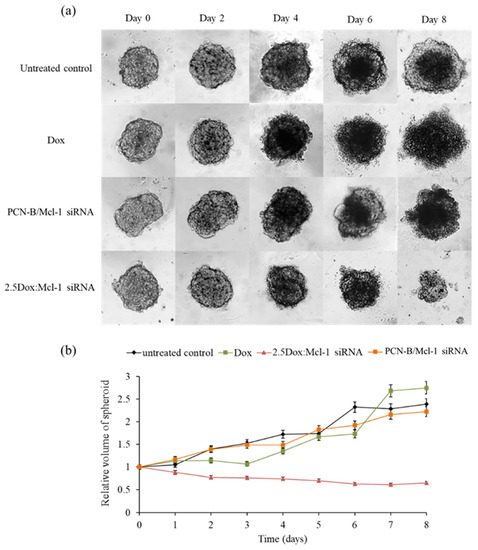 Synergistic effect on the growth of MCF-7 3D spheroid cells (a) spheroid images under a microscope at various time points and (b) relative volume of spheroids from day0-day8. The Dox and Mcl-1 siRNA concentration were used at 1.25 and 0.5 µM, respectively, for the individual treatments and the combination.