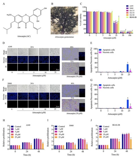 Cytotoxicity of artocarpin on A549, H460, ELC12, ELC16, ELC20, and BEAS-2B cells. (A) Chemical structure of artocarpin. (B) The whole plant of A. gomezianus. (C) Cytotoxic effect of artocarpin on A549, H460, ELC12, ELC16, and ELC20 cells. The cells were treated with several doses of artocarpin (0–100 µM) for 24 h; cell viability was measured by MTT assay. The percentage of cell viability was calculated relative to the control group. (D–G) Apoptotic and necrotic A549 and H460 cells were detected by Hoechst 33342/PI staining and visualized by fluorescence microscopy. Percentage of apoptotic/necrotic nuclei in artocarpin-treated cells was analyzed. (H–J) The proliferative effect of artocarpin on A549, H460, and BEAS-2B cells was analyzed by MTT assay. Scale bar represents 50 µm. The data are presented as the mean ± SD (n = 3). * p < 0.05 versus the non-treated control.
