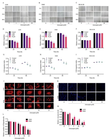 Cancer metastasis is a multi-step process that includes cell migration and invasion, which are hallmarks of malignant cancer [,]. We found that artocarpin was able to significantly attenuate A549 (Figure 2A) and H460 cells (Figure 2B) movement in a dose-dependent manner over the experimental period. Meanwhile, we also found that artocarpin (0–10 µM) had no effect on cell migration in normal lung BEAS-2B cells at 24 h (Figure 2C,F). Artocarpin significantly inhibited A549 cell migration at the concentrations of 5–10 μM at 24 and 48 h, compared with the non-treated control (Figure 2A,D,G). These results were similar to the effects on the migration of H460 cells, whereby H460 cell motility was also significantly suppressed by 5–10 μM artocarpin at 24 and 48 h (Figure 2B,E,H). Consistently, the effect of the compound on filopodia formation was evaluated and the results indicated that artocarpin at non-cytotoxic doses suppressed the number of filopodia in these lung cancer cells (Figure 2G,L). In addition, cell invasion was detected using a transwell Boyden chamber assay, whereby the cells were treated with artocarpin (0–25 μM) for 24 h. We found that artocarpin was able to decrease the number of migrating and invading cells through the matrigel layer of the assay at 24 h in a dose-dependent manner, compared with the non-treated control (Figure 2K,M). An invasion assay was also performed, and it was found that artocarpin could decrease the number of invaded A549 and H460 cells.