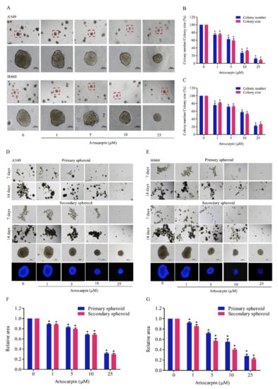 Artocarpin suppresses anchorage-independent growth and cancer stem cell (CSC)-like phenotypes of lung cancer cells. (A–C) A549 and H460 cells were pre-treated with non-toxic doses of artocarpin (0–10 μM) and a toxic dose (25 μM) at 37 °C for 24 h, and were assigned to an anchorage-independent growth assay for 2 weeks. (D–G) Cells were treated with artocarpin (0–25 μM) for 24 h, and the cells were suspended and allowed to form primary spheroids for 14 days. After dissociation of the primary spheroids, the cells were allowed to form secondary spheroids. Next, the spheroid of cancer stem cell (CSC)-rich population was investigated. All data are represented as mean ± SD (n = 3). * p < 0.05, versus the non-treated control.