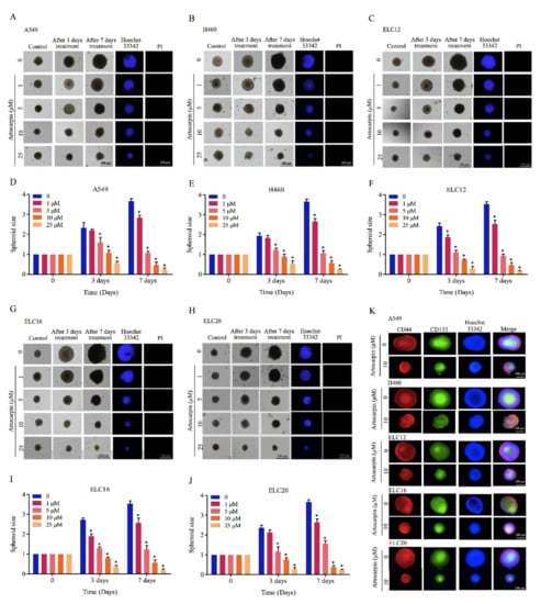 Artocarpin suppresses CSC growth in a CSC-rich population. (A,D) A549, (B,E) H460, (C,F) ELC12, (G,I) ELC16, and (H,J) ELC20 secondary spheroids were selected and treated with artocarpin (0–10 µM) for 3 and 7 days. Phase-contrast images of secondary spheroids at days 0, 3, and 7 and untreated cells were determined. At 7 days, single spheroid was stained with Hoechst 33342 to aid visualization of the cell nucleus. (K) The expression levels of CD44 and CD133 were determined using the anti-CD44 and anti-CD133 antibody, followed by the Alexa Fluor 594-labeled secondary antibody, and Alexa Fluor 488-labeled secondary antibody and determined using fluorescence microscopy. Data represent the mean ± SD (n = 3). * p < 0.05, versus non-treated control.