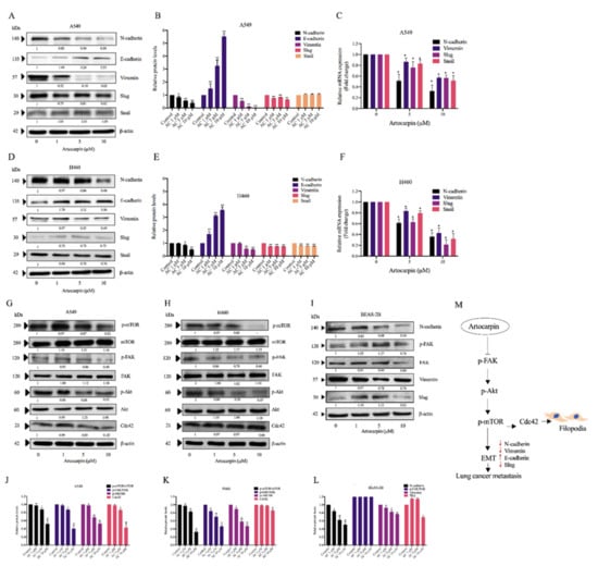 Effect of artocarpin on epithelial to mesenchymal transition (EMT): A549, H460, and BEAS-2B cells were treated with various concentrations of artocarpin (0–10 μM) for 24 h. (A–I) The expression levels of EMT protein markers were investigated by Western blotting, as well as the mRNA expression levels of EMT markers (C,F) were obtained by quantitative real-time polymerase chain reaction. Blotting membranes were probed with β-actin to confirm equal loading of samples. (G–I) The expression levels of Cdc42, mTOR, FAK and Akt proteins, and their phosphorylated forms, were investigated. (J–L) Relative protein levels were quantified using densitometry. β-actin was used as loading control. The data are shown as mean ± SD (n = 3). * p < 0.05, ** p < 0.01 versus non-treated control. (M) Schematic mechanism of artocarpin in suppression of EMT markers and filopodia formation in lung cancer cells.