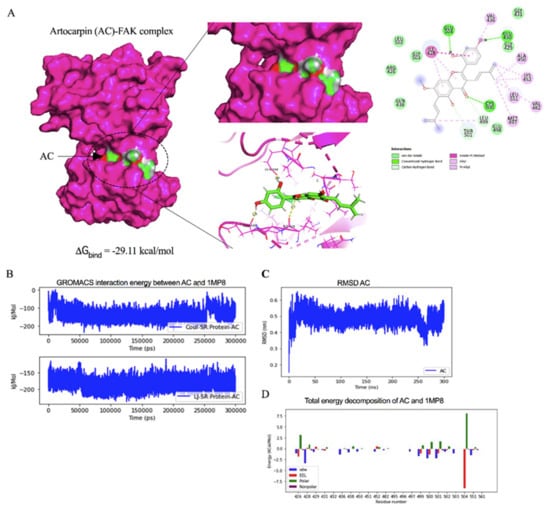 Docked model depicting interaction of artocarpin (AC) with FAK protein. (A) Binding mode and docking energy of AC bound to the binding site of FAK taken from the MD study. (B) The GROMACs interaction energy between artocarpin (AC) and FAK (1MP8). (C) The RMSD plot for interaction of artocarpin-FAK complex during 300 ns of molecular dynamic simulation. (D) Total energy decomposition of artocarpin-FAK complex using the gmx_MMPBSA program.