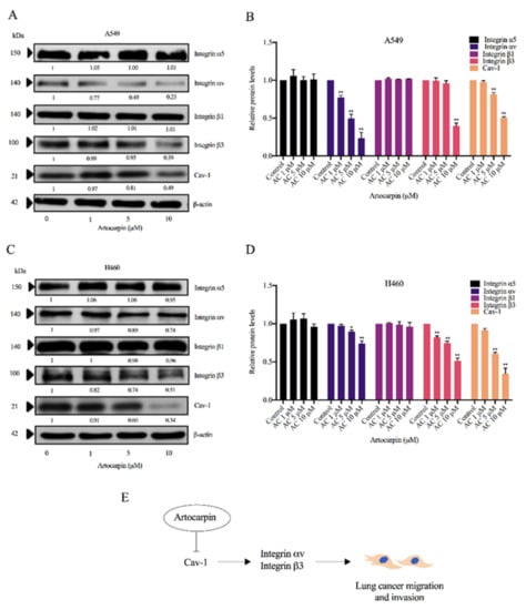 The scaffolding protein Cav-1 was shown to have an impact on behaviors of cancer cells, including cell movement and anoikis resistance. In addition, Cav-1 was shown to control the expression pattern of integrins. As certain integrins including integrins αv and β3 were shown to associate with progression and anchorage-independent growth of cancers, we investigated the effect of artocarpin on altering the pattern of the integrins as well as the Cav-1 expressions. The cells were similarly treated with non-toxic concentrations of artocarpin (0–10 μM) for 24 h. The protein expression levels of integrins α5, αv, β1, and β3 as well as Cav-1 were determined by Western blotting. We found that artocarpin significantly decreased the protein expression of integrins αv and β3 as well as Cav-1 in both A549 (Figure 7A,B) and H460 (Figure 7C,D) cells when compared with the control. Figure 7E shows a schematic mechanism for the artocarpin-mediated integrin switch in human lung cancer cells. Our previous study indicated that Cav-1 plays a key role in the regulation of cancer metastasis []. The Cav-1 protein has been demonstrated to control anoikis resistance in lung cancer cells []. Thus, we suggest that Cav-1 may inhibit cell migration via integrins αv and β3.