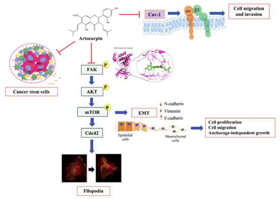 Regarding EMT, it was shown that the Akt and mTOR pathways control the EMT process []. Irie et al. reported that Akt has a function in regulating growth factor-stimulated EMT and cell migration []. Recent studies have shown that FAK has been identified as a critical regulator of cancer cell survival, proliferation, and migration [,]. The inhibition of this FAK molecule may benefit cancer therapy in several approaches. It was shown that signals from microenvironment of cancer can activate several survival pathways including Akt and NF-κB. Interestingly, the blockage of FAK was shown to suppress such survival signals from stromal of cancer cells, inhibit invasion, and induce cell apoptosis [,]. Likewise, as mTOR is a downstream target of Akt, Gulhati et al. demonstrated that mTORC1 and mTORC2 are the important regulators of EMT []. Lamanuzzi et al. reported that mTORC2 regulates tumor angiogenesis in multiple myeloma (MM), and suggested that the combined mTOR inhibitor PP242 with lenalidomide and bortezomib exhibited synergistic activities in inhibiting angiogenesis in vivo in the Chick Chorioallantoic Membrane (CAM) and Matrigel®® plug assays []. Consistent with the above findings, we found that artocarpin reduced the active Akt and mTOR, followed by a reduction of the EMT markers, revealing the molecular cascade of action of the compound in the regulation of EMT (Figure 5). Accordingly, FAK and mTOR also play an essential role in the regulation of cancer cell migration, invasion and metastasis as well as EMT process []. Zheng et al. suggested that the FAK/PI3K/Akt signaling pathway mediate EMT of endometrial cells in adenomyosis following the upregulation of FAK []. On the other hand, some studies have suggested that mTOR complexes regulate EMT via RhoA and Rac1 signaling pathways in prostate cancer []. Indeed, the regulation of endothelial cell (EC) functions that are tightly regulated by anti-angiogenic factors via the suppression of the αvβ3/FAK/mTOR signaling pathway []. In summary, we have revealed the novel effects of artocarpin in suppression of cell migration, EMT, CSC-like phenotypes, and the migratory-associated integrins via the interaction with FAK resulted in the suppression of the FAK/Akt/mTOR pathway (Figure 8). These findings demonstrate a promising distinctive effect of artocarpin on lung cancer cells that may lead to opportunities to use as an anti-cancer compound in cancer therapy.
