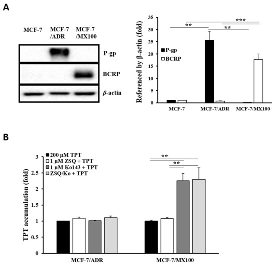 P-gp- and BCRP-overexpressing in vitro system. (A) Western blotting analysis using anti-P-gp and anti-BCRP antibodies in ADR and MX100 cell lines versus the MCF-7 cell line. (B) TPT (200 μM) accumulation after co-treatment with zosuquidar (1 μM), Ko143 (1 μM), and the combination of both (1 μM each) in ADR and MX100 cells. P-gp: P-glycoprotein; BCRP: breast cancer resistance protein; TPT: topotecan; ZSQ: zosuquidar; ZSQ/Ko: the combination of zosuquidar and Ko143. ** p < 0.01; *** p < 0.001.