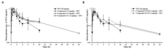 Compounds whose dual inhibition of P-gp and BCRP had been confirmed in vitro were investigated for their inhibitory effects in our animal model. TPT (20 mg/kg) dissolved in the modified Taxol® formulation containing Cremophor® EL, PEG 400, Tween® 80, and isotonic saline solution mixed with DMSO (9:1, v/v) was orally administered to rats with or without each compound (2 mg/kg). Figure 3 and Table 1 show the mean plasma concentration–time profiles and PK parameters of TPT, respectively. In spite of the lack of statistical significance, all the compounds increased the AUCINF of TPT by approximately 1.4- to 2.0-fold, with a moderate decrease in Clt/F. Compound 2 exhibited the most prominent effects in the in vitro study (Figure 2B,C), where it demonstrated 1.6- and 2.1-fold increases in the Cmax and RB of TPT, respectively, whereas compound 13-1 demonstrated approximately 2.0-fold increase in the RB of TPT compared to TPT only (Figure 3 and Table 1). In addition, the Tmax of TPT was similar in the presence or absence of the compounds, and the second peak was monitored in the plasma TPT concentration–time profile after co-administration with compounds LL344 (4 h) and LL347 (6 h) (Figure 3).