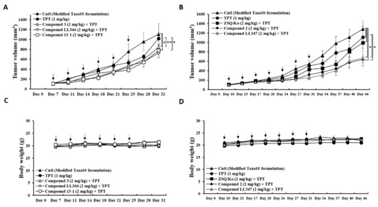 Among the dual inhibitor candidates, compounds derived from benzoxanthone (2, 205.7 ± 86.7% and 3, RB: 168.2 ± 70.5%), coumarin (LL344, RB: 161.6 ± 85.2%), and xanthone (13-1, RB: 207.2 ± 99.4%) showed a greater enhancement of oral TPT BA (Table 1) and multiple-dose TPT-induced tumor growth reduction (Figure 4A,B). This tumor growth reduction by the dual inhibitors was considered the result of the increased oral TPT BA (Table 1), although species-related differences (mouse vs. rat) could also play a role.