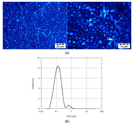 (a) Images of multi-lamellar liposomes (MLLs) after shearing observed under polarized light, and (b) their size distribution when dispersed in water.