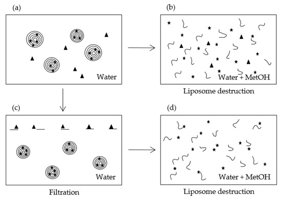 The method requires working with porous membranes so that (i) their pore size is larger than the liposomes’ diameter, and (ii) their composition ensures a high retention of the molecule of interest and a low retention of the liposomes. Hence, in this method, filters are used to retain the material and not the carriers, which is the opposite way of the classical filtering methods. As schemed in Figure 2, part of the liposome dispersion (Figure 2a) is treated in order to break the MLLs and release the encapsulated molecule (Figure 2b) while the other part is filtered (Figure 2c). The filtrate is then also treated to destroy liposomes (Figure 2d). Liposome destruction can be induced by adding either a solvent such as ethanol or methanol, or a surfactant like Triton. In the case of MLLs, Gonzalvez Gomez et al. demonstrated that methanol was much more efficient than Triton [26]. This solvent was then used in this study.