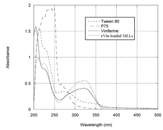 Figure 3 collects UV-vis spectra of the different MLL components. As reported in literature, εVin in methanol presents a maximum of absorption at 325 nm [11]. The calibration curve of εVin (Supplementary Materials Figure S1) was established in a mixture of MetOH:water (1:1 v:v), the solvent in which εVin was co-solubilized with MLL components (Figure 2b,d). After destruction of εVin-loaded MLLs, a peak at 325 nm was observed in the spectrum but its intensity (0.4) is higher than the expected value (0.29) considering εVin concentration (5 µg mL−1) and the calibration curve equation. This is due to the contributions of MLL components after MLL destruction as seen in Figure 3—P75 the main component of MLLs also absorbed at 325 nm when solubilized in MetOH:water, as Tween 80 but to a much lesser extent.