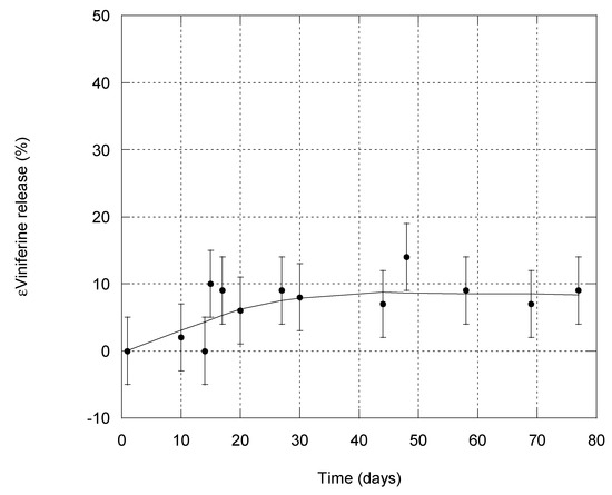 The release of εVin from MLLs was studied for 77 days by repeated quantification of EE using the adsorption filtration separation method. A total of 4 wt% of stilbene was introduced in the composition of MLLs. Before each measurement, the entire dispersion (50 mL at 1 mg mL−1) was centrifuged at 500 rpm for 10 min in order to induce precipitation of any εVin that would have leaked from MLLs and formed aggregates (see Section 4.2). This low rate ensured that MLLs did not precipitate. Analyses were then conducted on the supernatant. To quantify EE, Acomp. was fixed to its initial value of 0.12 (measured on day 1) to remove any bias arising from the removal of part of the free εVin which could have precipitated. Moreover, the value at 436 nm measured on the initial dispersion, (Table 1) was systematically controlled. This value should be constant as long as the liposome structure is maintained (Section 3.2.2). Its value was 0.22 at day 1 and any value differing from 0.22 ± 0.02 was not considered. Microscopic observations were also conducted every week to check that MLL structure was intact; this was the case even after 77 days. The time dependency of EE is reported in Figure 5 and shows that εVin release from MLLs was very slow. After 77 days, 69% of εVin was still encapsulated. As εVin was embedded into the bilayers of MLLs, its release was slow.