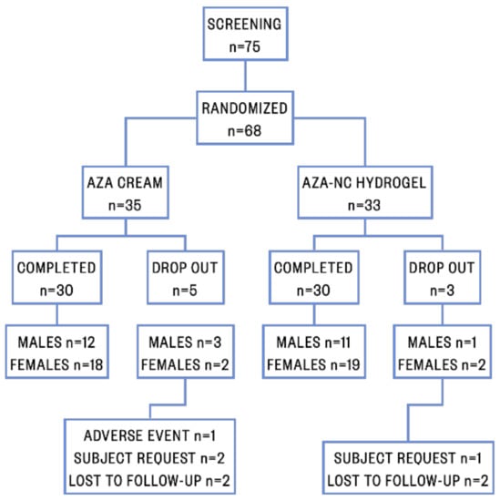 Seventy-five patients were initially screened, of whom 68 patients fulfilled the inclusion criteria and were randomized in two treatment groups: (i) thirty-five patients (51.47%) were randomized to AV treatment with AZA cream and (ii) thirty-three patients (48.53%) were randomized to AV treatment with AZA-NC hydrogel. Eight patients were excluded from the study; specifically, an adverse event occurred in one patient treated with AZA cream, three patients (two treated with AZA cream and one treated with AZA-NC hydrogel) requested to be excluded, and four patients (two treated with AZA cream and two treated with AZA-NC hydrogel) were lost to follow-up. The patient flow diagram is shown in Figure 2.