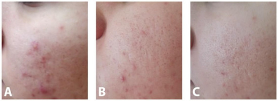 Patient with mild to moderate acne vulgaris at baseline (A), after four weeks (B) and after eight weeks (C) of treatment with AZA-NC hydrogel.