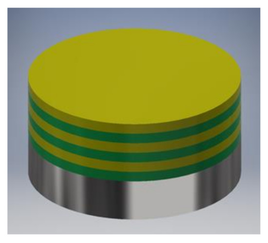 As-prepared AISI 316LVM samples (as described in Section 2.1) were placed in the center of a POLOS SPIN-150i-NPP spin coater (SPS Vertriebs GmbH, Germany) and held in place with a vacuum pump. To ensure even spreading of the first layer, 200 µL of CMC solution was placed in the center of the substrate surface, and the sample was spun. The spinning parameters were the same for every layer application: spinning velocity 2500 rpm, acceleration 500 rpm/s, and spinning time 180 s. 100 µL of the DEX solution (either DEX1 or DEX2.5) was placed in the center of the CMC-coated substrate to apply the second layer. Next, an additional CMC layer was applied by placing 100 µL of CMC solution on the previously coated surface. A multilayer coating was formed on the substrate by alternately adding the CMC and the DEX layers, as schematically depicted in Figure 1. Coated samples were named 3CMCxDEXy, where 3 and x are the number of layers and y is the concentration of the DEX solution. Depending on the DEX solution used, the samples were named 3CMC3DEX1, 3CMC2DEX1, 3CMC3DEX2.5, and 3CMC2DEX2.5, where the DEX1 and DEX2.5 terms stand for the solution used to prepare these coatings (as described above).