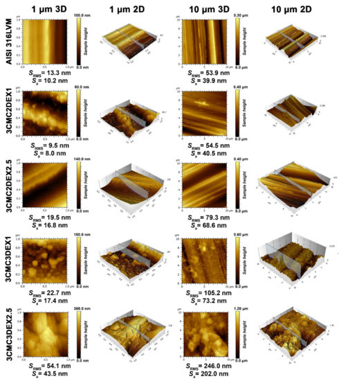 AFM topography measurements for all samples and AISI 316LVM in 2D and 3D, accompanied by the corresponding roughness parameters.