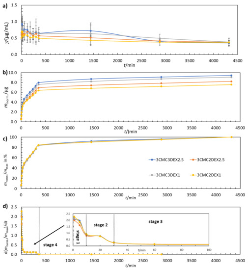 All identified release stages in Figure 4 were fitted using five common mathematical release models by converting the data into the respective parameters given in Table 2. In the table, w is the mass fraction of released DEX, Qmax (%) is the maximum amount of released DEX, and Qt (%) is the amount of released DEX at a given t. These parameters were plotted as required to fit the data with respective release models in order to obtain a linear trend line. The latter was then used to obtain the square of the correlation coefficient (R2). The release model with the highest R2 value, i.e., for which the R2 value was closest to 1.000, was considered to be the most probable to explain the release mechanism for the respective stage. The obtained R2 values are given in Table 3.