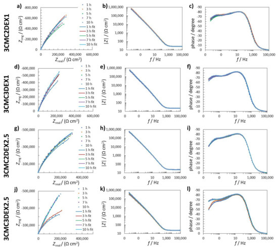 (a,d,g,j) Nyquist impedance; (b,e,h,k) Bode impedance; and (c,f,i,l) phase angle EIS spectra measured in 0.9 wt.% NaCl solution for (a–c) 3CMC2DEX1; (d–f) 3CMC3DEX1; (g–i) 3CMC3DEX1; and (j–l) 3CMC3DEX1 samples. The measured data are represented with dots, whereas fitted data are given as solid lines.
