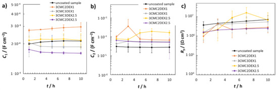 Figure 6 shows the EIS fitted data obtained by using RΩ(Q2(R2(Q1R1))) EEC. The average C1 values were similar for the uncoated sample and the coated samples with 6 layers, i.e., 3CMC3DEX1 and 3CMC3DEX2.5 (Figure 6a). On the other hand, the coated samples with 5 layers showed different C1 properties than the uncoated sample. The 3CMC2DEX1-coated sample had higher and the 3CMC2DEX2.5-coated sample lower average C1 values compared with the uncoated sample. As expected, the surface layer properties (the average capacitance values C2) were different for the coated samples compared to the uncoated sample, i.e., for every coated sample, the average C2 values were higher than that for the uncoated sample. The latter is a consequence of the coating application. The most important parameter obtained from the EIS fitting procedure is the Rp value. The average Rp values obtained for the coated samples are shown in Figure 6c (the average Rp values for the uncoated samples are given for comparison [48]). The change in Rp values for the coated samples and uncoated sample is not significant (as tested with the ANOVA with a 95% confidence level). Therefore, the coatings applied have no significant influence on the general corrosion susceptibility of AISI 316LVM.