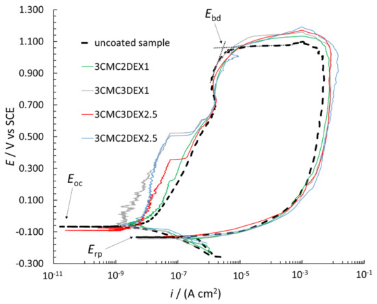 In order to further investigate the possible increased localized corrosion susceptibility of the coated samples compared to the uncoated sample, CP curve measurements were performed (Figure 7). The breakdown potential (Ebd), repassivation potential (Erp), and Eoc are designated in the figure. The Ebd is determined by extrapolation (as shown in the figure), with the i suddenly increasing due to the surface breakdown, indicating significant localized corrosion (pitting and crevice formation). The Erp defines the potential, based on which evaluation of the repassivation capability is possible, i.e., if Erp is at more positive potentials than Eoc, the metallic material can repassivate. However, none of the measured samples in Figure 7 has that capability (neither the uncoated nor coated samples). Moreover, the Erp is similar for all samples. All CP curves are in the cathodic region (in the potential region from −0.250 V vs. Eoc to the Eoc) at similar i. On the other hand, the CP curves in the anodic region (more positive than Eoc) up to approximately 0.500 V vs. SCE are at different i for the uncoated and coated samples, i.e., the curves are at lower i for the coated compared to the uncoated samples. The latter indicates that these coatings even mitigate corrosion of AISI 316LVM to a certain degree. Moreover, the Ebd is at similar values for all CP curves, indicating similar localized corrosion behavior for both the uncoated and coated samples. After the breakdown in the reverse scan, the i was higher than that for the forward scan, which is typical of stainless steel materials in chloride solution (once corrosion starts, it can no longer be prevented). Based on the above explanations, the CP curve measurements suggested that the susceptibility to corrosion of the samples with the applied coatings did not increase, but minor corrosion protection of the coated samples can be expected.