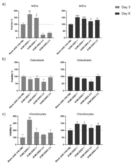 The cell viability testing results of (a) mesenchymal stem cells, (b) osteoblasts, and (c) chondrocytes cultured on uncoated and CMC/DEX-coated AlSI 316LVM scaffolds after 3 and 6 days of incubation. Cell viability is expressed as % relative to control (uncoated AISI 316LVM). Values are shown as the mean ± standard deviation (three replicates). Statistical significance was defined as * p < 0.05, ** p < 0.005, and *** p < 0.0005 compared to the control sample (ANOVA test).