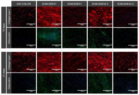 Dexamethasone induces osteogenic differentiation of MSCs. Cells were incubated for 14 and 21 days before immunostaining for osteo-specific markers. Red: collagen type I. Green: osteocalcin. Blue: cell nuclei (DAPI).