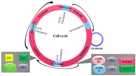 Cancer, a disease of uncontrolled cell division, is known to exhibit a series of changes in the activity of cell cycle regulators [1]. All cancer types arise from a single cell that has transformed due to genetic or regulatory alterations, resulting in uncontrolled cell division in response to mitogenic signals [2]. Mitogenic signals include genetic and epigenetic aberrations in cell cycle regulatory genes. These mitogenic stimuli make oncogenic changes, resulting in cell transformation [3]. The gain-of-function mutations cause the activation of proto-oncogenes, which are normally present in the suppressed state in differentiated cells under epigenetic control [4]. Oncogenic stimuli have the potential to induce transformation of the differentiated cells, causing alterations in genetic material and therefore stimulating the development of certain cancers [5,6,7]. Loss-of-function mutations lead to a decreased expression of tumor suppressor genes, resulting in the diminishment of tumor-protective functions [8,9,10,11]. The collective data obtained suggest that distinct pathways of genetic alteration lead to cancer [11]. Products of both oncogenes and tumor suppressor genes regulate cell cycle machinery [8,12]. There are different phases of the cell cycle, and progression through these phases requires many regulatory components, which include oncogenic genes (CDKs (cyclin-dependent kinases) and cyclins) and tumor suppressor genes (cyclin-dependent kinase inhibitors) [13]. The identification and subsequent functional analysis of cyclins and CDKs enable us to understand the molecular mechanism of cell-cycle machinery [14]. In the pathogenesis of breast cancer, cyclins A, B, C, D1, and E; CDKs; and CDK-inhibitors, such as p21 (Waf1/Cip1), p27 (Kip1), p16 and 53, are known to play important roles in cell cycle control [15] (Figure 1). Each cell cycle phase is tightly regulated in normal cells [15]. After exposure to mitogenic stimuli, however, these regulatory components become deregulated, which predisposes the cellular transformation of breast epithelial cells. Numerous studies implicate the roles of oncogenic and tumor-suppressive components in various human cancer types, including the initiation and development of breast cancer, more specifically [9,16,17]. In addition, several research bodies have confirmed the prognostic significance of oncogenic and tumor suppressor components in regard to therapy or clinical outcomes [18]. Significant information exists on the regulation and roles of the cell cycle components in breast cancer cells, and previous studies may be utilized for therapeutic purposes. Findings from experimental studies also support that alterations in these components are clinically significant [19]. The aim of this review article is to summarize the role of various oncogenic and tumor suppressor components of the cell cycle that are involved in breast cancer progression and prognosis.