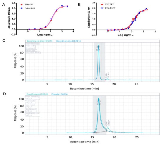 Stability assessment of spray dried EPT. The production of EPT standard is described in the methods section. The stability of dried EPT post-drying and after 9 months was assessed by GM1−capture KDEL−detection ELISA and SEC-HPLC. A representative binding curve of spray dried EPT is shown for (A) one day post-drying and (B) after 9 months stored at 23 °C in a desiccator, compared to an EPT standard. SEC-HPLC chromatogram of (C) non-dried EPT (blue) and EPT one day post-drying (green) and (D) dried EPT (green) after 9 months stored at 23 °C in a desiccator (EPT standard is in blue). After 9 months dried EPT contained 91.8% pentamer and 8.2% monomer (* represents a line drop as the two peaks are not completely resolved). The resolution value of the two peaks is 1.6 (determined by OpenLab CDS 2.1 software, Agilent Technologies, Santa Clara, CA, USA).