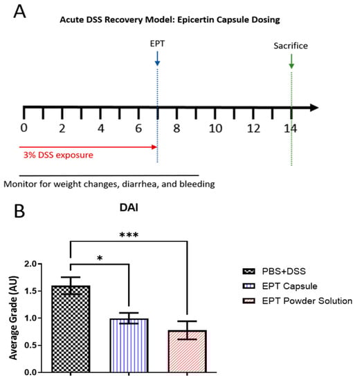 Enteric-coated EPT capsules mitigate acute DSS colitis in mice. (A) Study design. (B) Mice were dosed with an EPT capsule (n = 10), pre-dissolved EPT powder following gastric acid neutralization (EPT powder solution; n = 9), or capsule vehicle control (n = 10) on day 7 following DSS exposure. DAI scores were determined on day 14 as a combined measure of body weight recovery, stool consistency, and blood in stool; data are shown as mean ± SEM. * p < 0.05, *** p < 0.001, one-way ANOVA with Bonferroni’s multiple comparisons test.