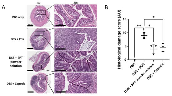 Acute DSS colitis model and EPT treatment. Groups of 10 female C57BL/6 mice, randomly assigned, were used. 3% (w/v) DSS (M.W. 36,000–50,000; M.P. Biomedicals, Santa Ana, CA, USA) was administered in drinking water ad libitum for 7 days. Body weights were monitored daily from the start of DSS exposure to sacrifice on day 14. On the last day of DSS exposure, animals were orally gavaged 100 µL PBS, 100 µL of EPT powder dissolved in PBS (0.03 mg/mL solution) after administration of sodium bicarbonate (200 µL of 30 mg/mL solution) as described previously, or enteric coated capsules filled with 5 µg EPT (described above) [15]. Animals recovered with normal drinking water for 7 days. Disease activity index (DAI) scores, consisting of body weight loss, fecal consistency and occult blood tests, were recorded following sacrifice and performed as previously described [25]. Distal colon tissues were fixed in neutral buffered formalin and stained with hematoxalin and eosin (H&E). Histopathological scores, a combination score comprised of crypt architecture, inflammatory infiltrate, muscle thickening and goblet cell presences scores, were determined as previously described [24,25]. Each category was ranked on a scale from 0 to 3 and summed to obtain a single histopathological damage score for each tissue.