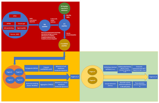 Figure 1 shows the whole process from the alignment of the peptide databases using the transcriptome of the skin of the frog B. pugnax until the final pugnins A and B. Peptides with 100% identity were found, representing already reported peptides by the literature in other species. Therefore, we searched for new peptide sequences in the transcriptome, obtaining 375 putative sequences. In order to find peptides with dual antibacterial-anticancer activity, a filter including physicochemical parameters and artificial intelligence algorithms was performed, which are described in detail below. Therefore, four candidate putative sequences derived from the cell penetrating peptide DS4.3 were obtained. Two pugnins A and B were synthesized and subjected to antibacterial analysis, cytotoxicity tests, circular dichroism, and flow cytometry in order to corroborate the in silico prediction.